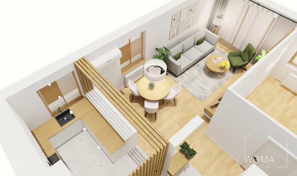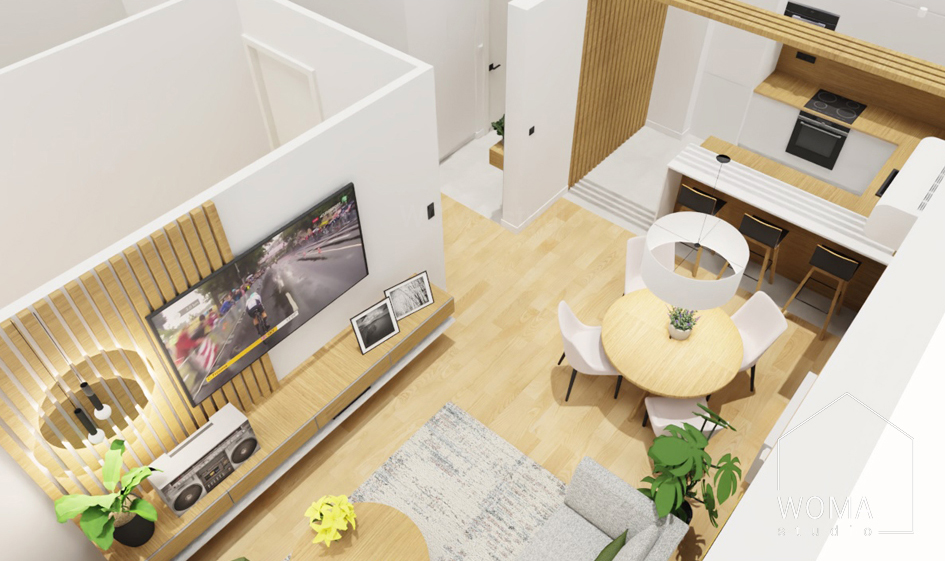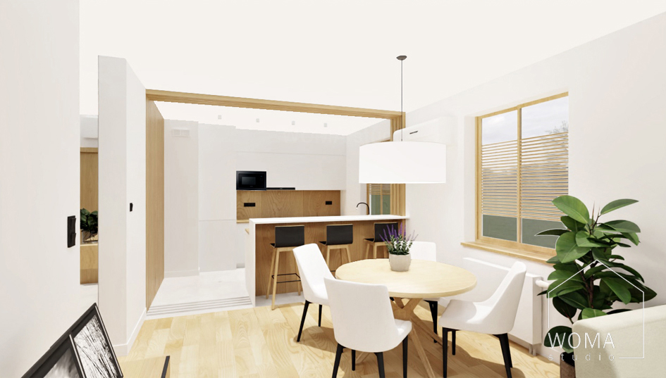Projekt wnętrz mieszkania na Wiślanym Mokotowie w Warszawie polegał na wyburzeniu ściany między kuchnią a salonem, dzięki czemu powstała dodatkowa przestrzeń jadalniana z okrągłym stołem i czterema krzesłami, a także na wyburzeniu ściany między kuchnią a przedpokojem i zamontowaniu w tym miejscu ażurowej ścianki z lameli drewnianych. Zlikwidowany został również otwór drzwiowy między salonem a korytarzem. W całym mieszkaniu położono panele drewniane. Jedynie w kuchni i łazience zamontowano płytki gresowe, a w toalecie podłogowe płytki ceramiczne. W mieszkaniu dominuje przede wszystkim funkcjonalność, prostota i minimalizm, które są charakterystyczne dla wnętrz nowoczesnych.