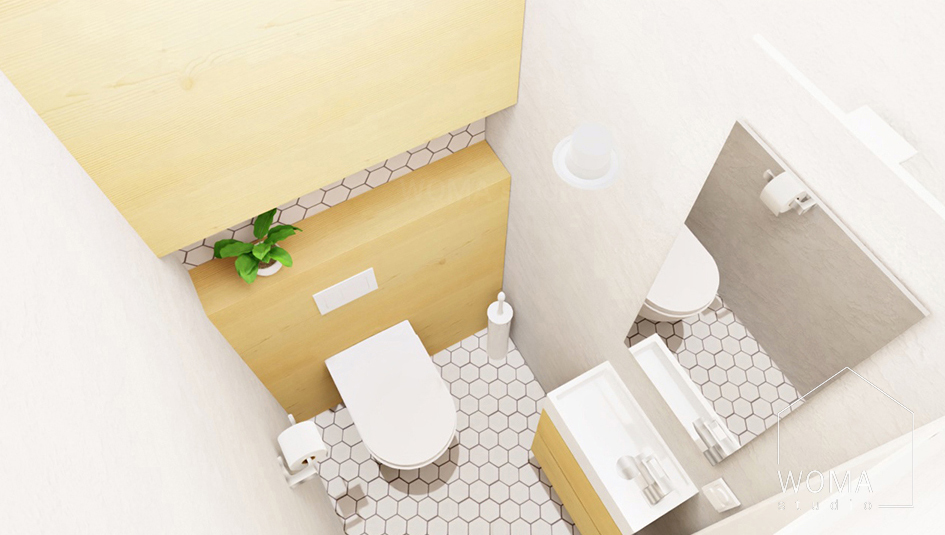 W niewielkim pomieszczeniu toalety udało się znaleźć sporo miejsca do przechowywania kosmetyków i detergentów. Nad miską ustępową znajduje się duża szafka wisząca. Umywalka zamontowana została bezpośrednio na szafce łazienkowej.