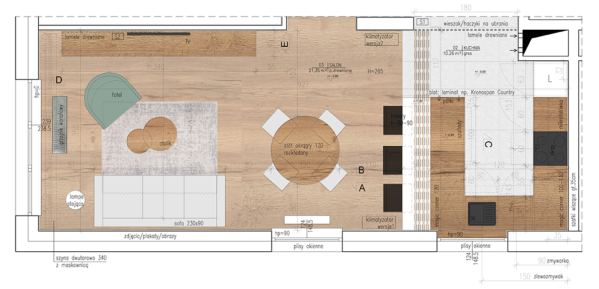 • zlikwidowanie ściany oddzielającej kuchnię z przedpokojem i zamontowanie ażurowej ścianki z lameli drewnianych