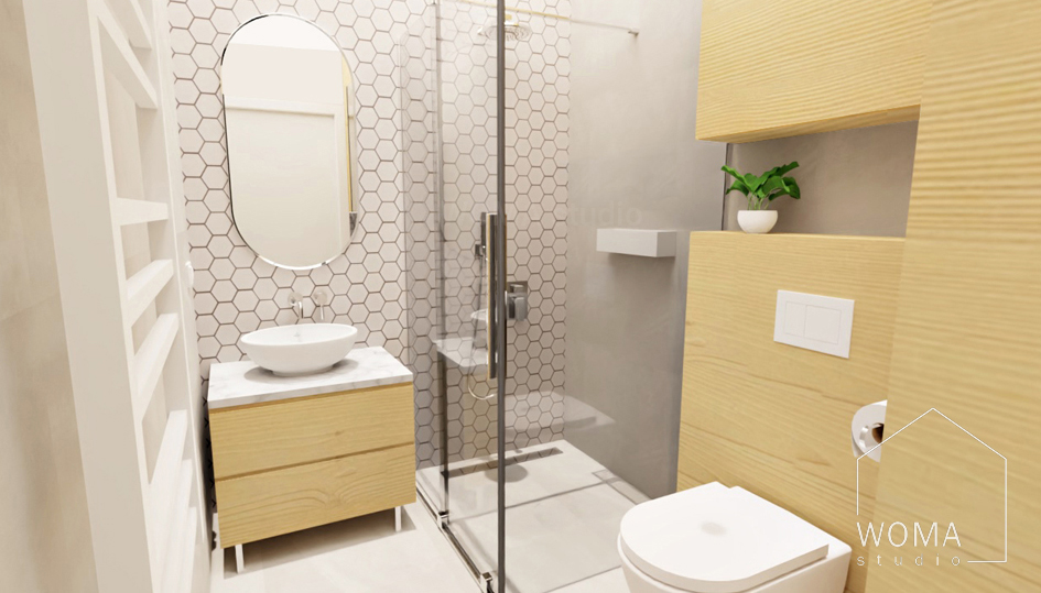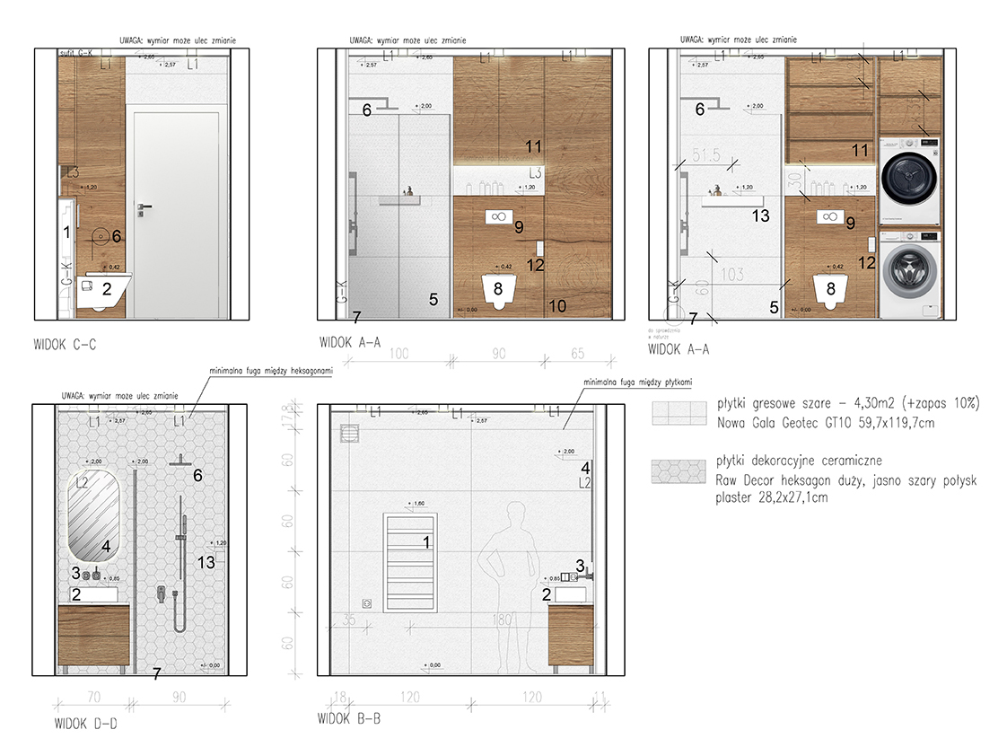 Do naszego zakresu prac projektowych należały również rysunki aranżacyjne łazienki oraz toalety. Oba pomieszczenia zaprojektowaliśmy w podobnym stylu. Wszystkie meble, w kolorze ciepłego drewna, zostały wykonane przez stolarza na zamówienie. W dużej zabudowie meblowej ukryliśmy pralkę z suszarką. Miski ustępowe i umywalki są wykonane z białej ceramiki, a armatura jest w kolorze chromu. Na podłogę i na ściany wybraliśmy płytki gresowe w odcieniu szarym. Elementem dekoracyjnym pomieszczeń stanowią eleganckie płytki ceramiczne w kształcie plastra miodu.